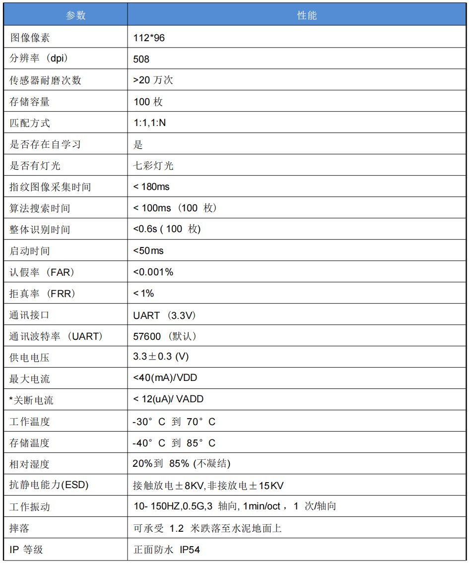 本產品使用自研最優指紋識別算法,業界領先的算法保證用戶最佳體驗效果。算法能自適應對干濕手指進行處理,算法具備自學習能力,指紋識別性能會隨使用次數不斷提高。